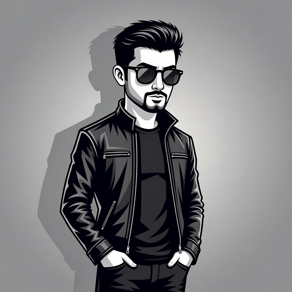 A black and white illustration depicts a young man with short dark hair, sunglasses, and a goatee standing confidently with hands in pockets. He wears a black leather jacket over a t-shirt and dark pants against a gray background with a shadow. The vector art style emphasizes sharp lines and dramatic shading.