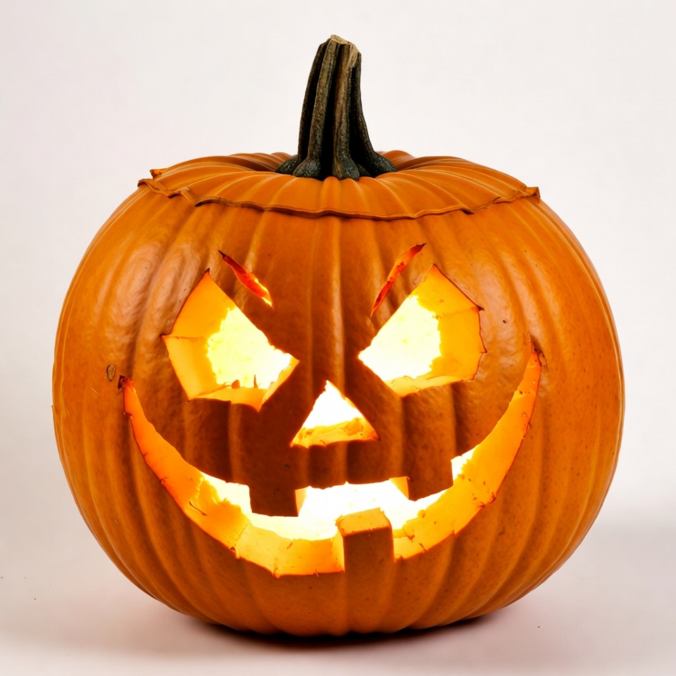 A carved orange pumpkin features a glowing jack-o'-lantern face with triangular eyes, nose, and jagged teeth. The interior candlelight illuminates the eerie expression from within. It sits on a plain white background.
