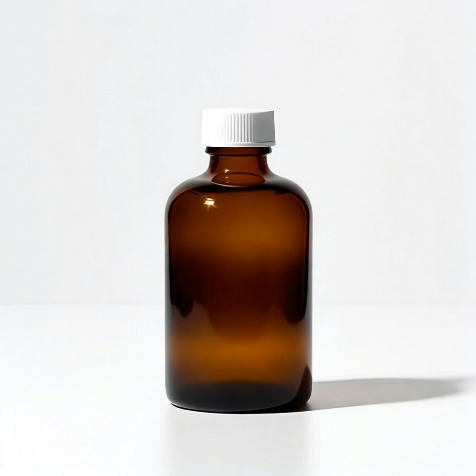 A clear amber glass bottle with a white plastic cap sits on a white surface. The bottle is viewed from the front against an isolated white background. Subtle shadows highlight its shape and glossy surface.