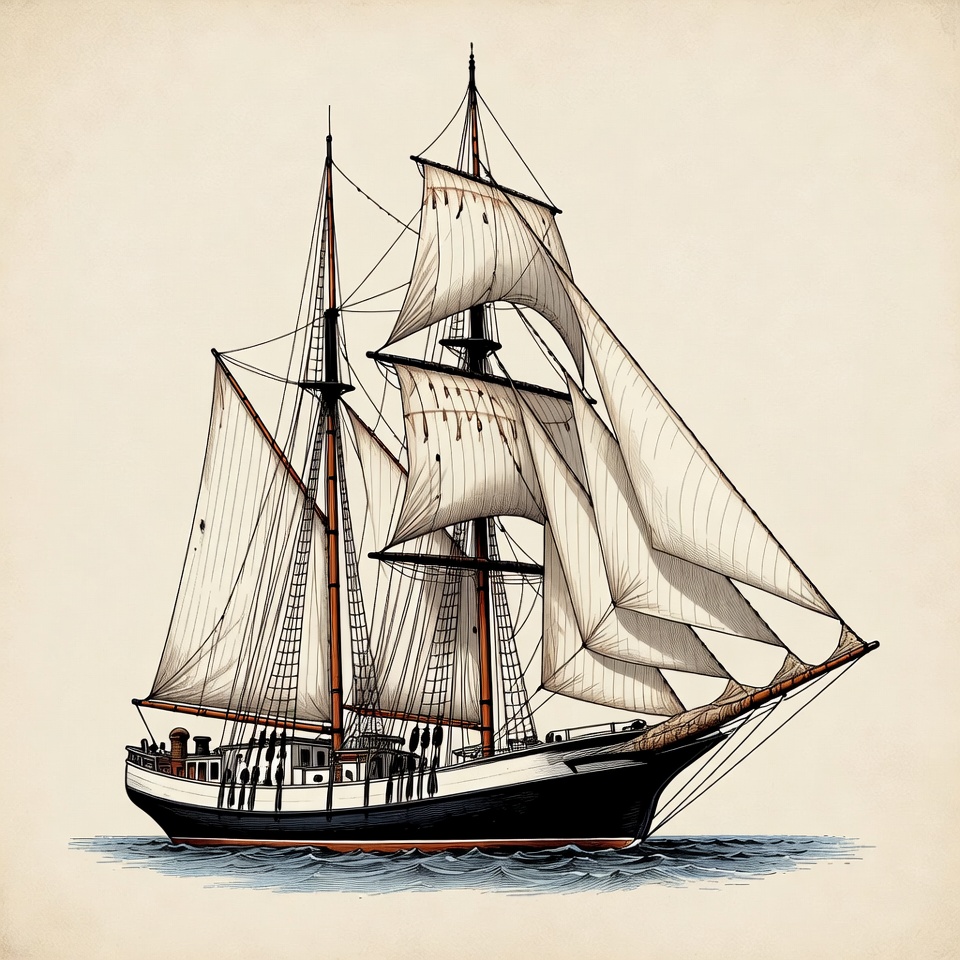 black hull, boat, brigantine, clipart, full sails, illustration, isolated background, maritime, masts, nautical, ocean, rigging, sails, sea, seafaring, ship, tall ship, vessel, vintage, white sails, wooden ship, sailing ship