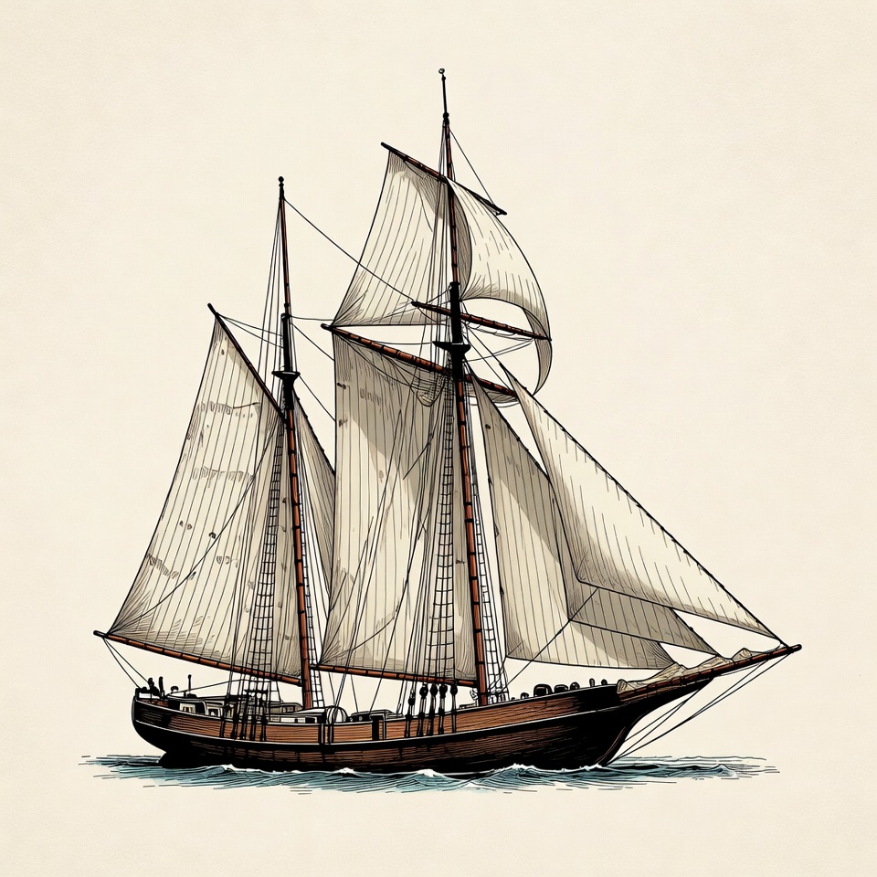 boat, brown hull, clipart, hull, illustration, isolated background, line art, maritime, masts, nautical, ocean, rigging, sails, schooner, sea, seafaring, ship, tall ship, vessel, vintage ship, white sails, wind sails, wooden ship, sailing ship