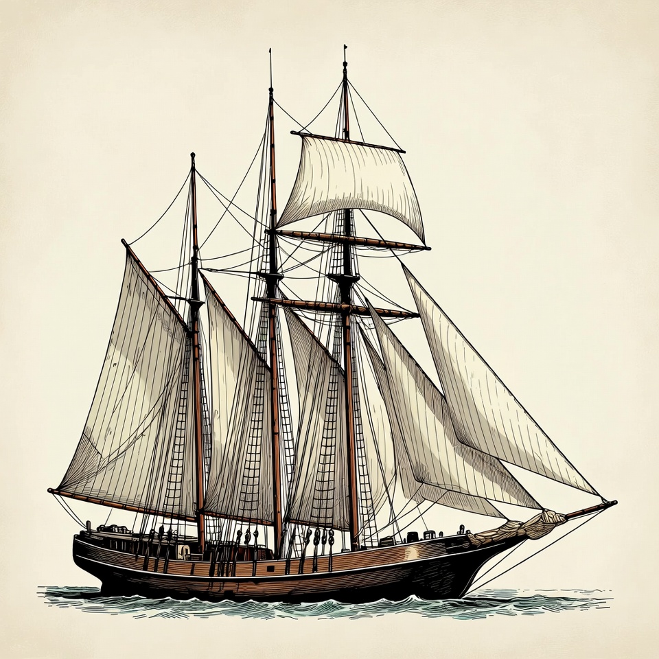 A detailed illustration of a classic wooden sailing ship with multiple masts and white sails billowing in the wind. The ship features intricate rigging and is depicted on a calm sea with a light brown hull. It is rendered in a vintage ink style on an isolated beige background.