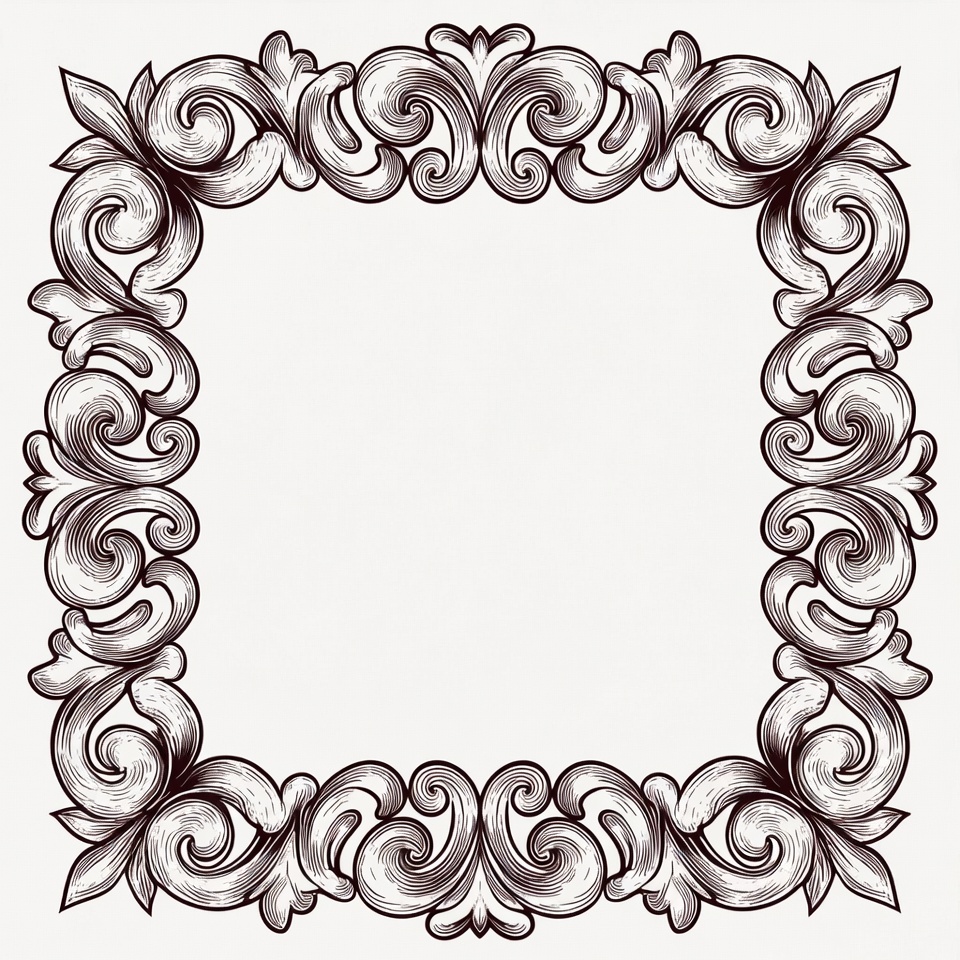 An intricate black line art frame features elaborate floral and scroll motifs in a symmetrical square design. The empty center provides space for text or images. The vintage engraving style includes swirling leaves and decorative curls.