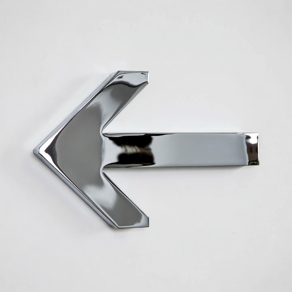 3D arrow, arrow, chrome arrow, direction arrow, isolated background, metal arrow, metallic arrow, navigation symbol, pointer, reflective surface, shiny arrow, silver arrow, white background, left arrow