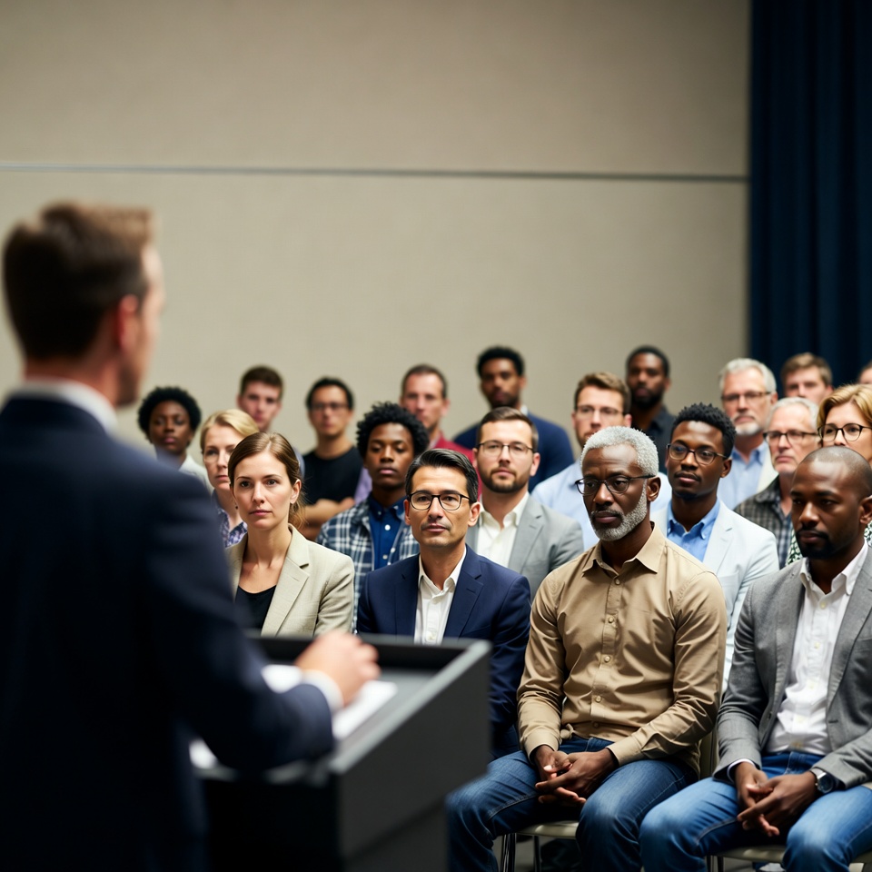 Man speaking at diverse audience podium