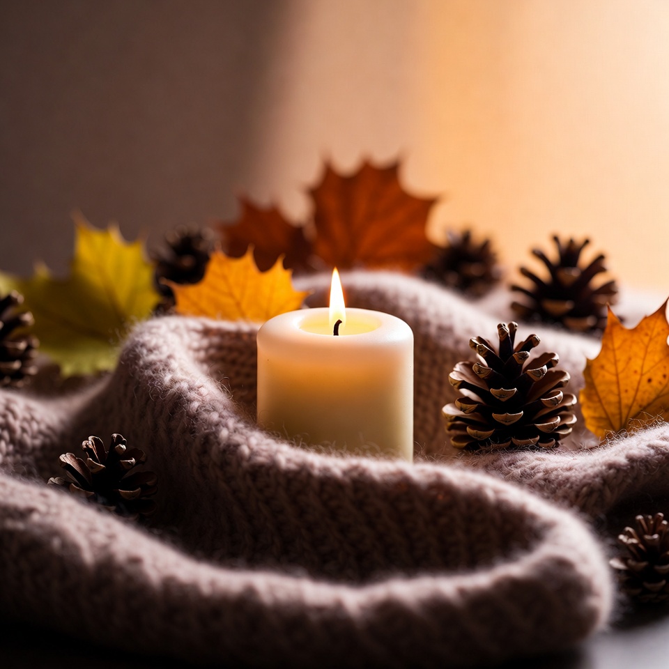 A white candle with a glowing flame sits nestled in a beige knitted sweater. It is surrounded by scattered orange and yellow autumn leaves and brown pinecones. The scene is softly lit against a neutral background.