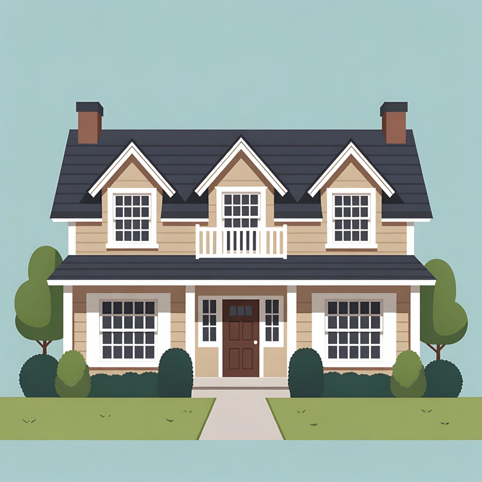 A flat illustration of a beige two-story house with a dark shingled roof and brick chimneys. It features a wraparound porch with white railings, multiple windows, and a central brown front door. Flanking bushes and a front lawn sit on a light blue isolated background.