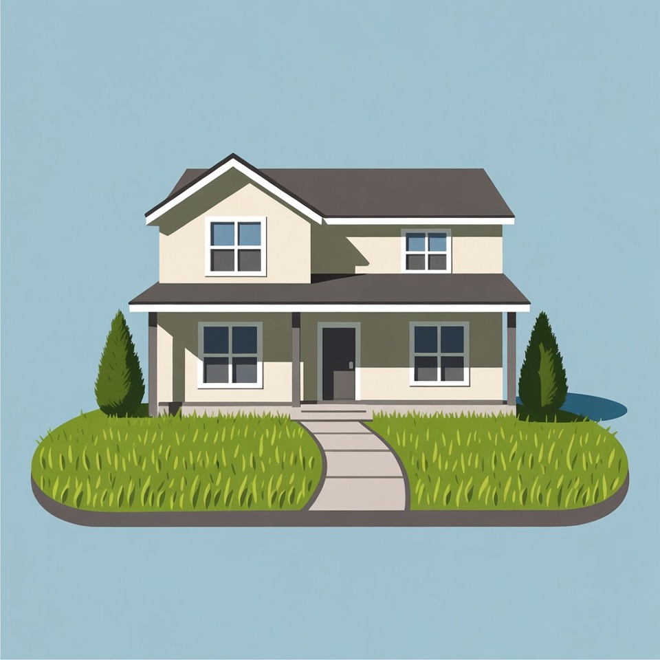 A simple illustration of a two-story beige house with a dark roof and covered porch sits on a grassy lawn. A concrete pathway leads from the street to the front door, flanked by tall evergreen shrubs. The house features multiple windows and is centered against a light blue background.