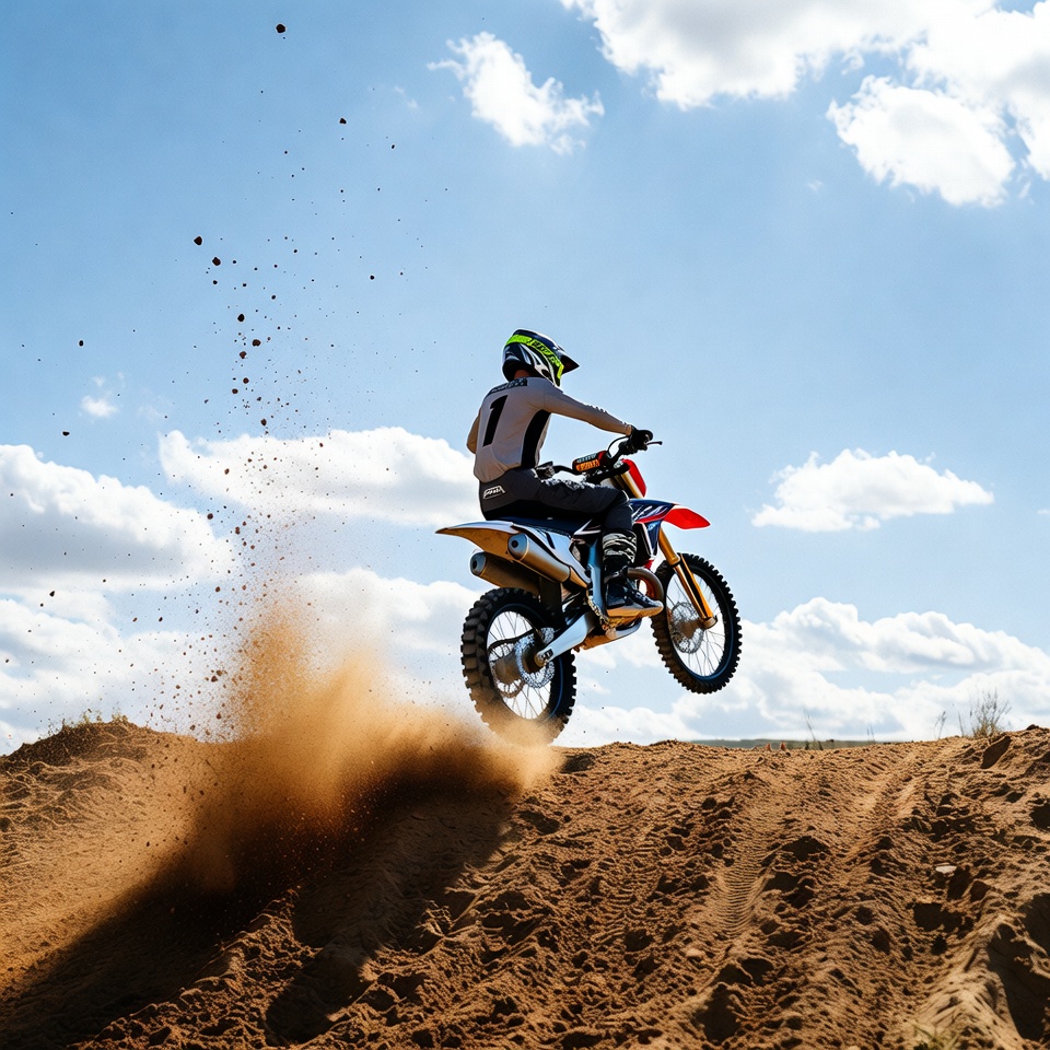 A man wearing a green motocross helmet and black riding gear performs a rear-wheel jump on a red Honda dirt bike. He is airborne over a sandy dune with dust flying from the rear tire. The scene is set against a clear blue sky with scattered white clouds.