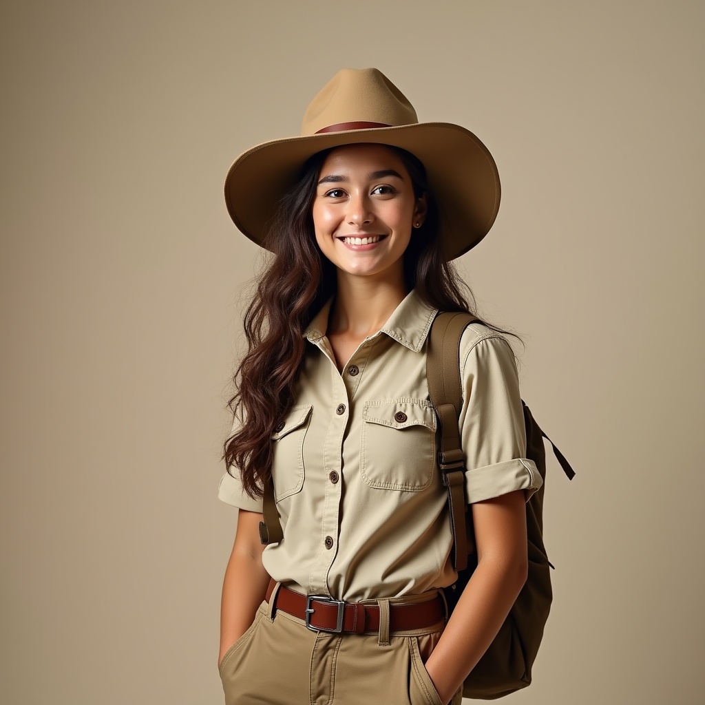 Asian, adventure, backpack, beige background, brown belt, explorer, female, happy face, isolated background, khaki pants, khaki shirt, long hair, outdoor gear, portrait, safari outfit, smiling, wavy hair, wide hat, young woman, woman