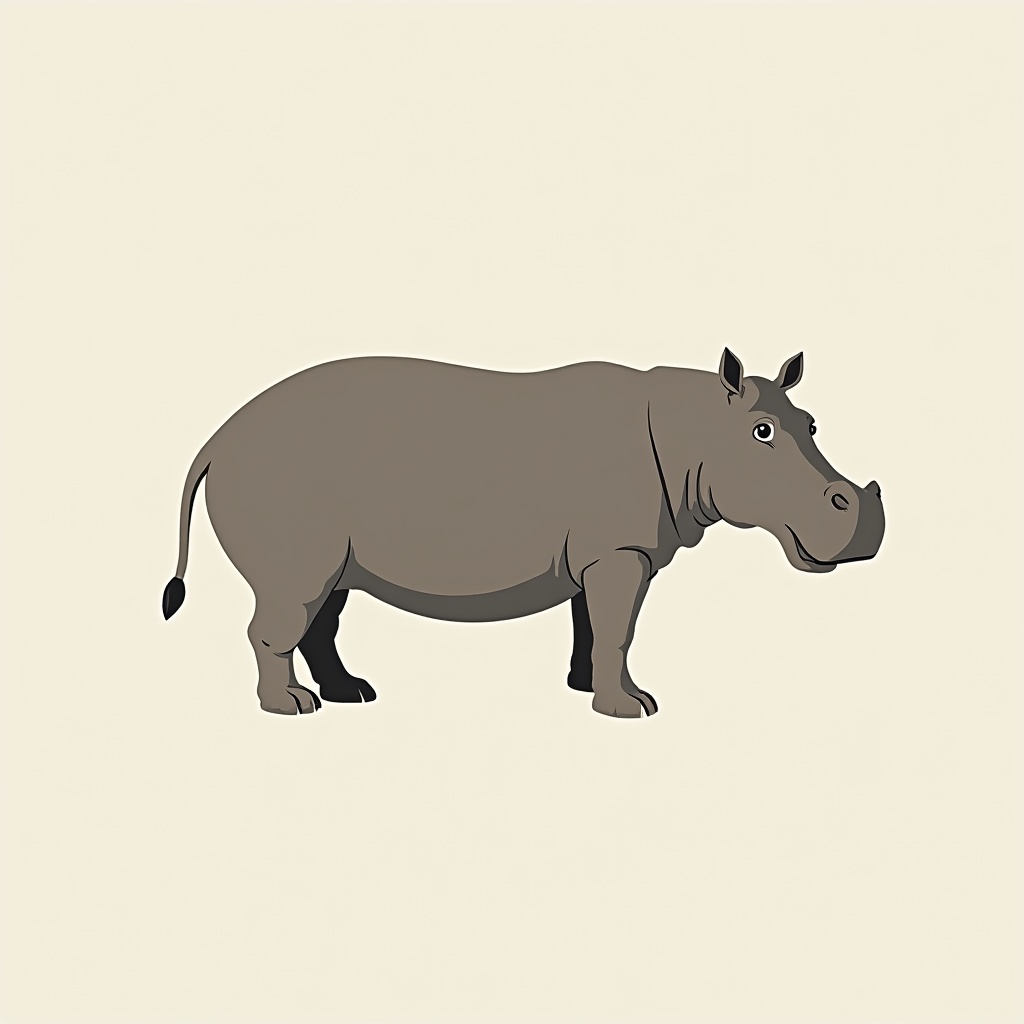 A simple cartoon illustration of a gray hippopotamus stands on a plain beige background. The hippo faces slightly to the side with a friendly expression, featuring large ears, a wide mouth, short tail, and sturdy legs. It is depicted in a flat vector style with clean lines and solid colors.