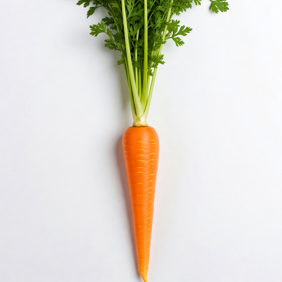 A single fresh carrot with vibrant orange root and lush green tops is centered on a white background. The carrot stands upright, showcasing its tapered shape and detailed texture. The green parsley-like leaves extend upwards from the top.