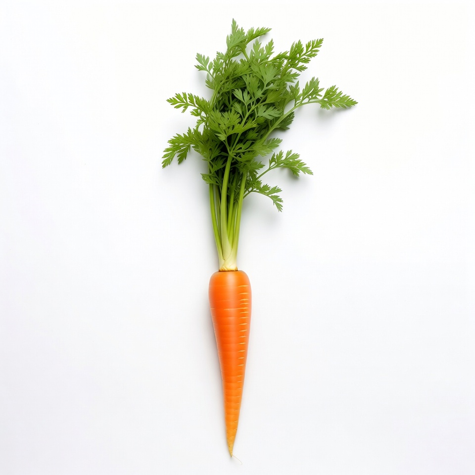 flat lay, food photography, fresh carrot, green tops, healthy food, isolated, leafy greens, orange carrot, organic carrot, produce, root vegetable, single carrot, vegetable, white background, carrot