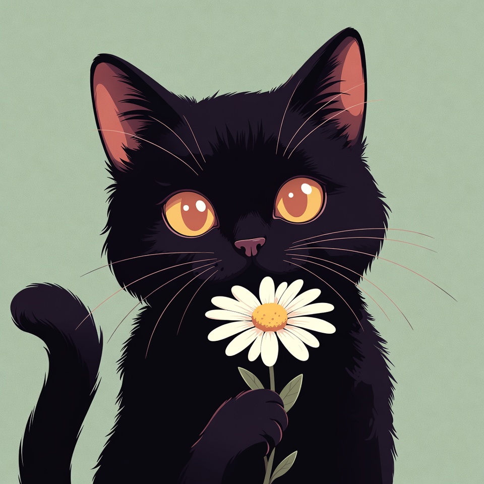 A cute black cat with large yellow eyes holds a white daisy flower in its paw. The cat has glossy black fur, pointed ears, and a fluffy tail, illustrated in a vibrant digital art style. It stands against a light green background.