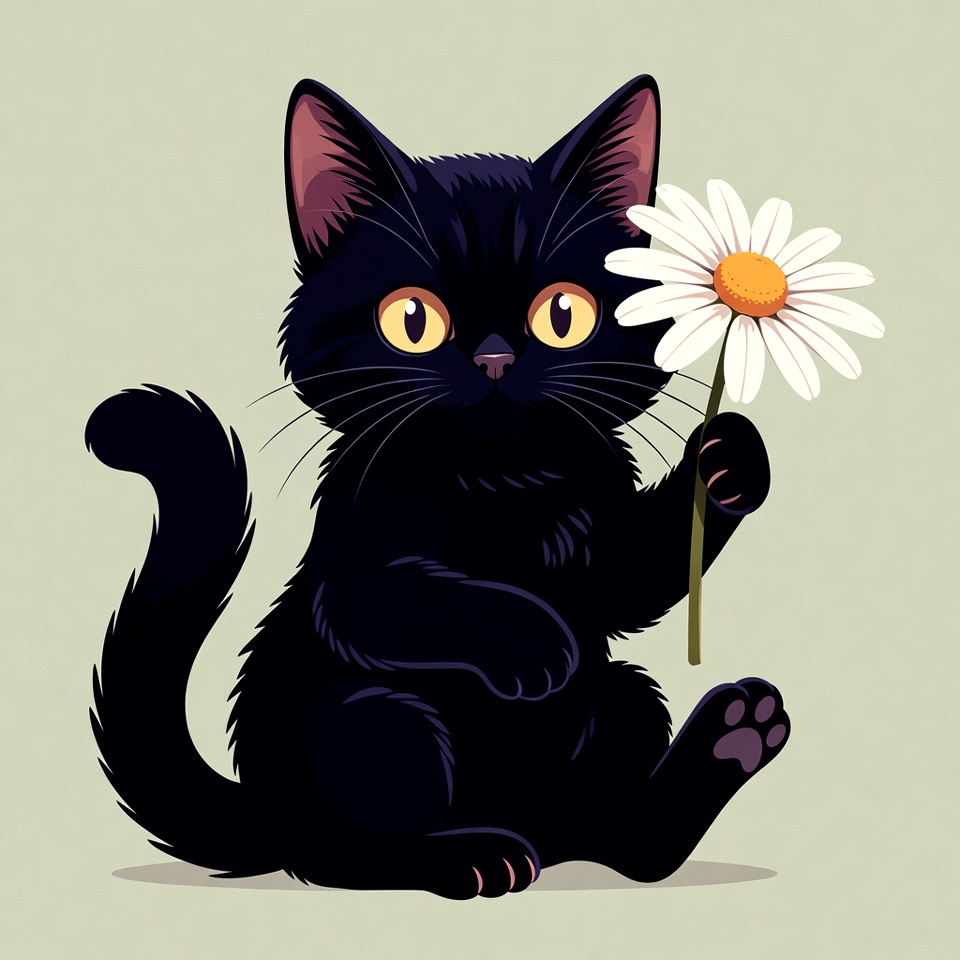 A cute black kitten with large yellow eyes sits on a light green background, holding a white daisy flower in its paw. The kitten has fluffy fur, pink inner ears, and a curled tail. This is a colorful digital illustration.