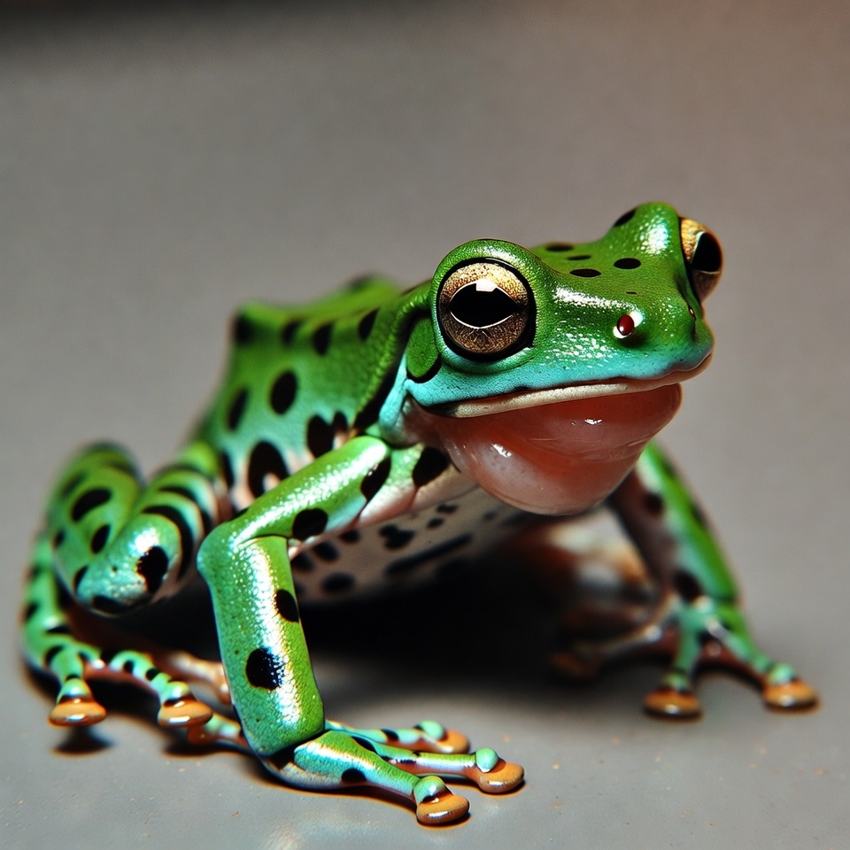 A vibrant green tree frog with black spots sits on a plain background. It has large bulging eyes and a pink mouth slightly open. Its legs are extended forward with orange toes visible.
