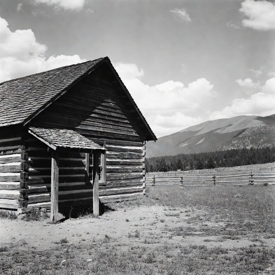 black and white, cabin, clouds, frontier cabin, grass, meadow, mountain landscape, mountains, old cabin, outdoors, pine trees, rustic cabin, sepia tone, snowy peaks, vintage photo, wilderness, wooden fence, wooden house, log cabin
