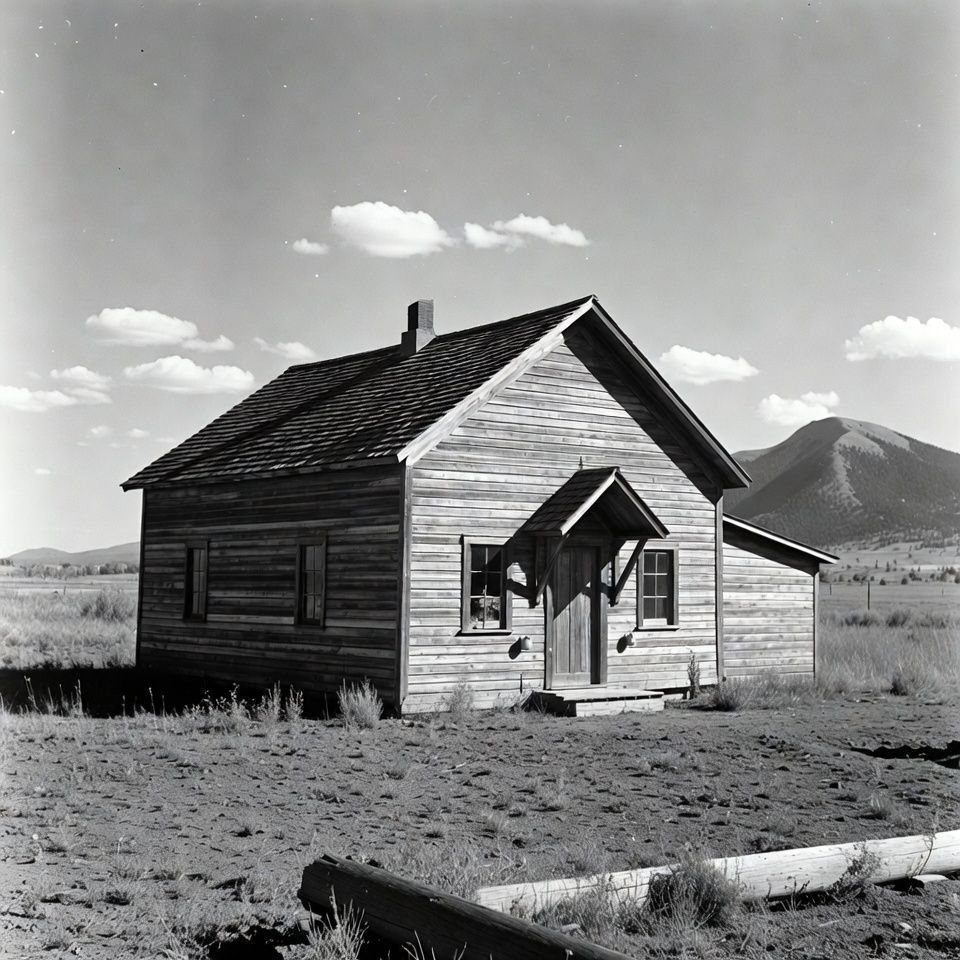 abandoned house, black and white, clouds, countryside, dry grass, field, front porch, isolated building, log cabin, mountain backdrop, old house, prairie, rural landscape, rustic shack, sky, vintage photo, volcano mountain, weathered wood, wooden roof, wooden cabin
