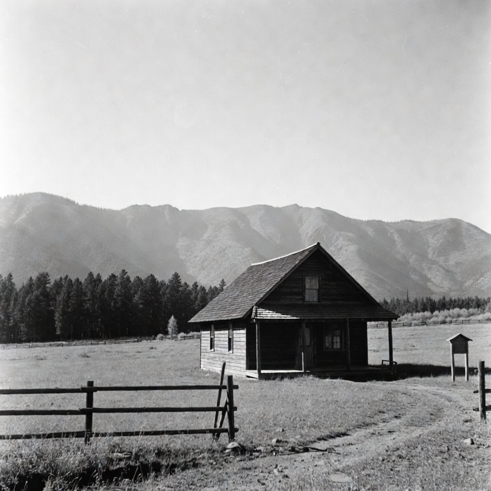 A small black and white photograph shows a rustic wooden cabin with a shingled roof and porch, situated in a grassy field surrounded by a wooden fence. Tall pine trees and distant snow-capped mountains form the backdrop. A signpost stands nearby on a dirt path.