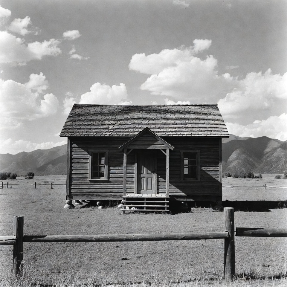 A small black and white photograph shows a weathered wooden cabin with a gabled roof and front porch. It stands in a grassy field surrounded by a wooden fence, with distant mountains and cloudy skies in the background. The cabin features two windows and a central door on the porch.