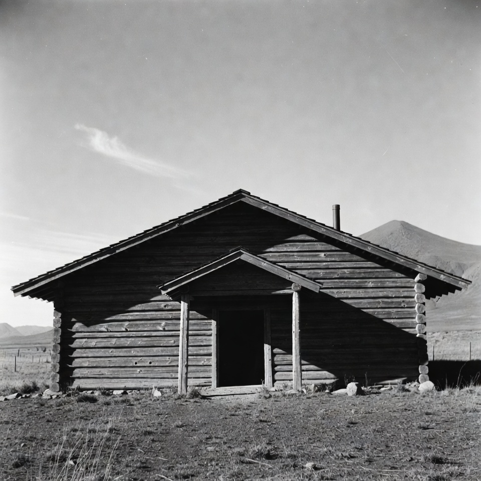 architecture, black and white, cabin, chimney, front porch, gabled roof, grassland, log house, monochrome photo, mountain landscape, mountains, outdoors, remote cabin, rocky ground, rural, rustic cabin, vintage photo, wilderness, wooden house, log cabin