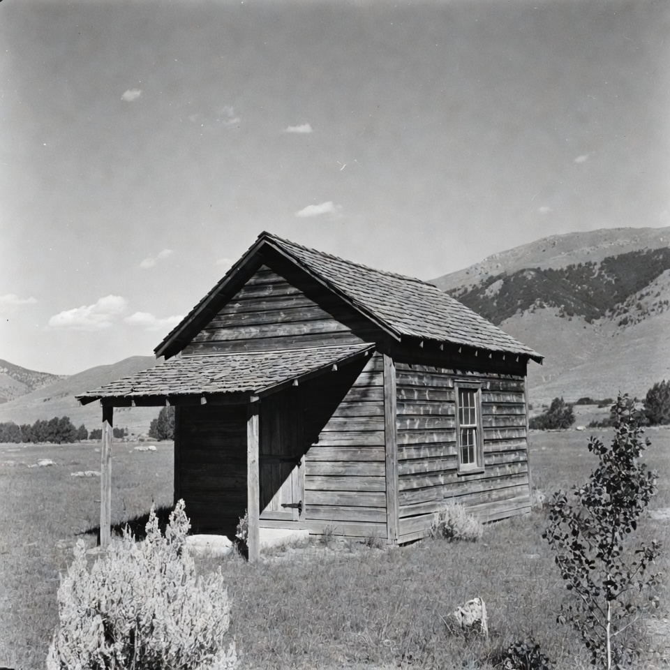 black and white, bushes, cloudy sky, front porch, grassy field, isolated building, log cabin, mountain cabin, mountains, old cabin, rocks, rustic cabin, shadows, shingled roof, small house, valley, vintage photo, weathered wood, wooden cabin, cabin
