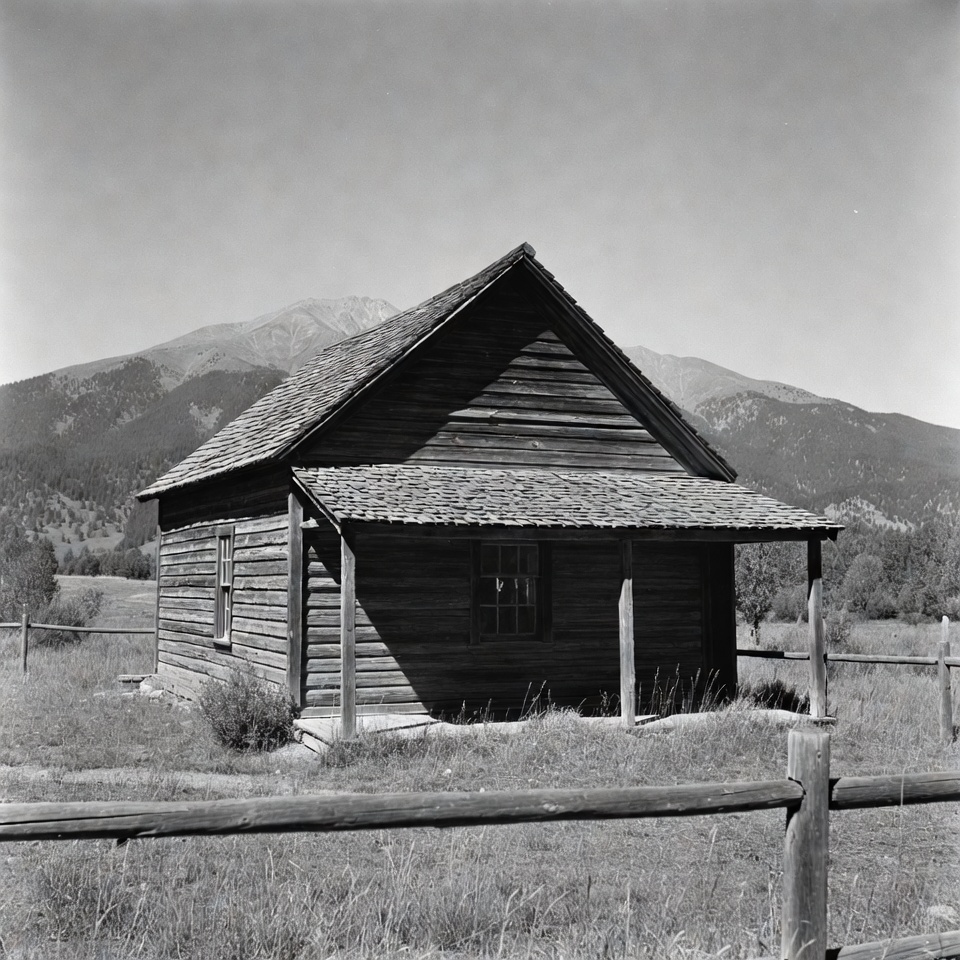 black and white, countryside, grass field, isolated building, log cabin, mountain cabin, mountains, old cabin, porch, rural landscape, rustic cabin, sepia photo, shingled roof, snowy mountains, vintage photo, windows, wooden cabin, wooden fence, wooden structure, cabin
