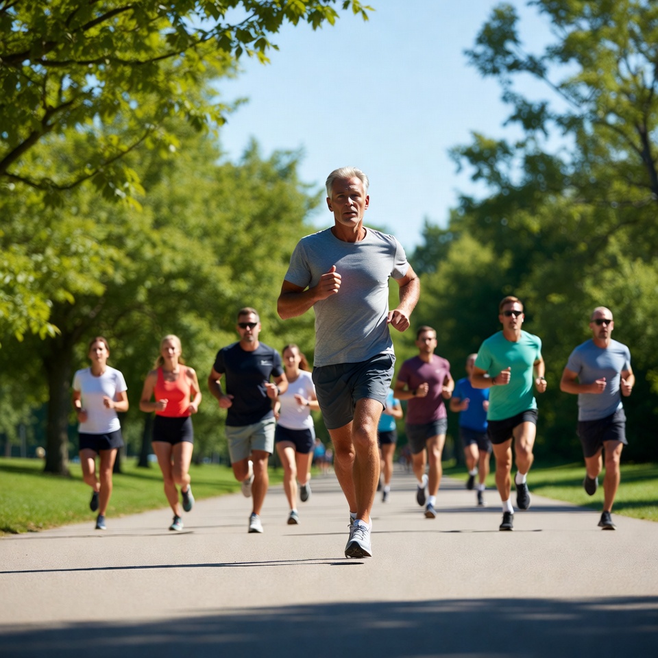 A diverse group of men and women jog along a paved path in a lush green park surrounded by trees. The runners wear athletic shorts and t-shirts in various colors and appear focused on their exercise. Sunlight filters through the canopy onto the asphalt trail.