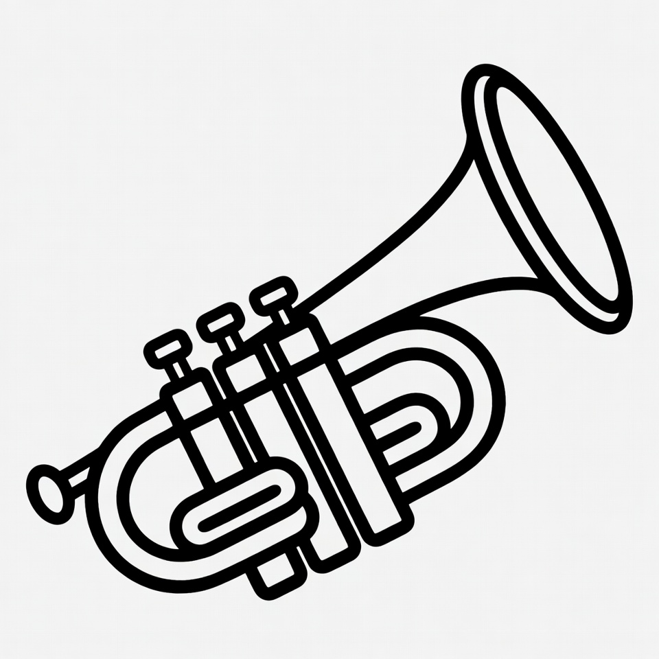 band instrument, black lines, brass instrument, clipart, illustration, isolated background, jazz trumpet, line art, music, musical instrument, outline, vector, white background, trumpet