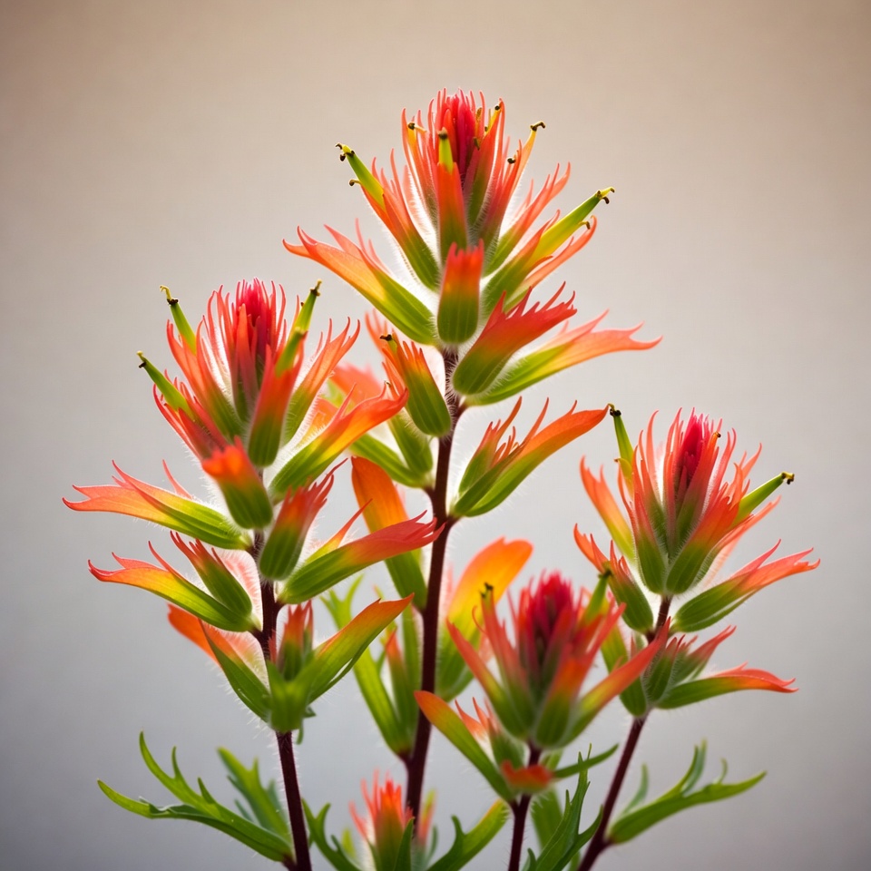 A vibrant cluster of Indian paintbrush flowers features bright red-orange bracts and green stems. The flowers stand tall against a plain beige background. Multiple blooms with fine details are captured in close-up.