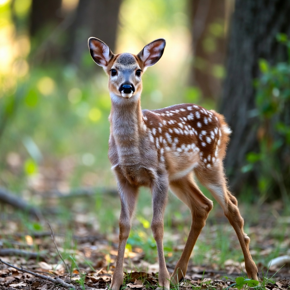 A young fawn with white spots stands in a lush green forest. It has large ears, a black nose, and alert eyes, surrounded by trees and fallen leaves. Sunlight filters through the foliage, highlighting its soft fur.