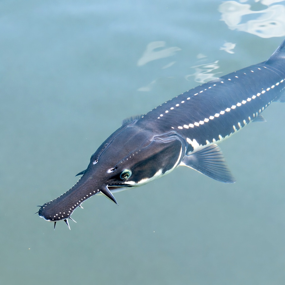 A beluga sturgeon swims gracefully in clear blue water. Its long snout protrudes prominently with small spines along the edges, and its sleek black body features white stripes. The fish's green eye is visible as it glides underwater.