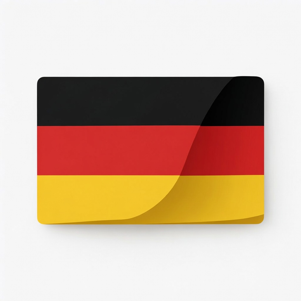 A vibrant illustration of the German flag with black, red, and yellow horizontal stripes. The flag has a glossy, curved 3D effect on a white isolated background. It features clean vector graphics with smooth color gradients.