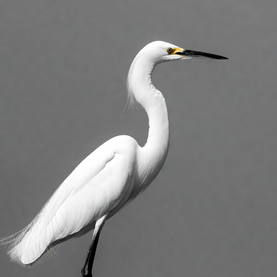 A white egret with a long neck and yellow beak stands gracefully on one leg. Its feathers are fluffy and detailed, with black legs contrasting against the plain gray background. The bird faces slightly to the side, showcasing its elegant form.