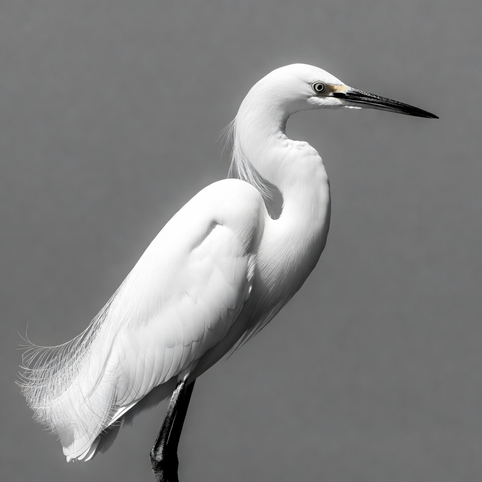 bird, black legs, feathers, gray background, heron-like, isolated, long beak, nature, one leg, plumes, standing, wading bird, white bird, white egret, wildlife, yellow eyes, egret