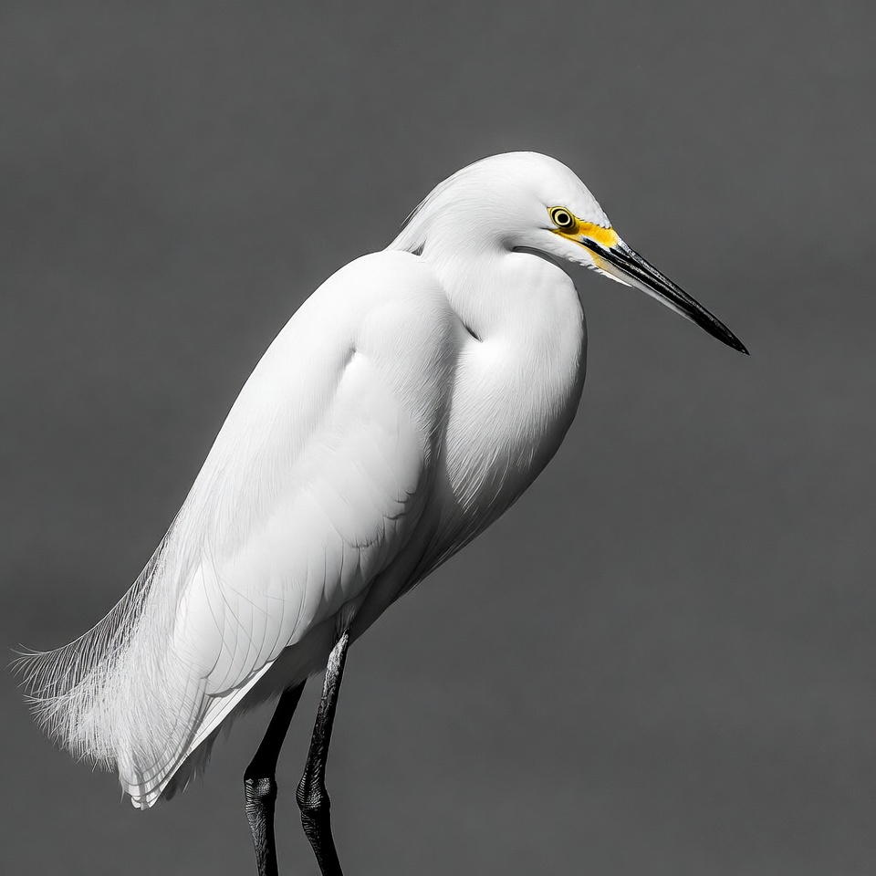 A snowy egret stands gracefully with its long black legs and slender black beak featuring a yellow tip. Its pure white feathers contrast sharply against the smooth gray background. The bird is captured in a side profile, showcasing its elegant neck and plumage.