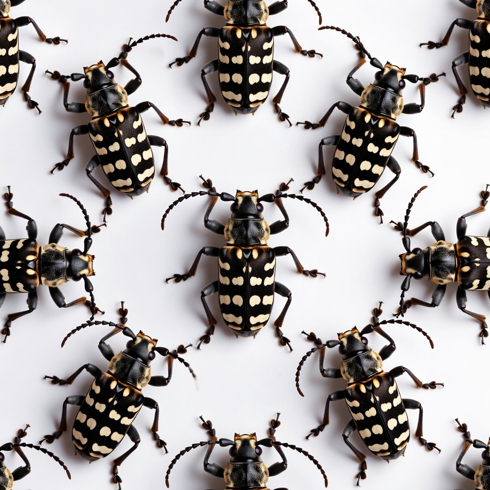 Multiple longhorn beetles with black and white spotted patterns are arranged in a circular formation. They feature long antennae and shiny exoskeletons. The insects are photographed against a plain white background.