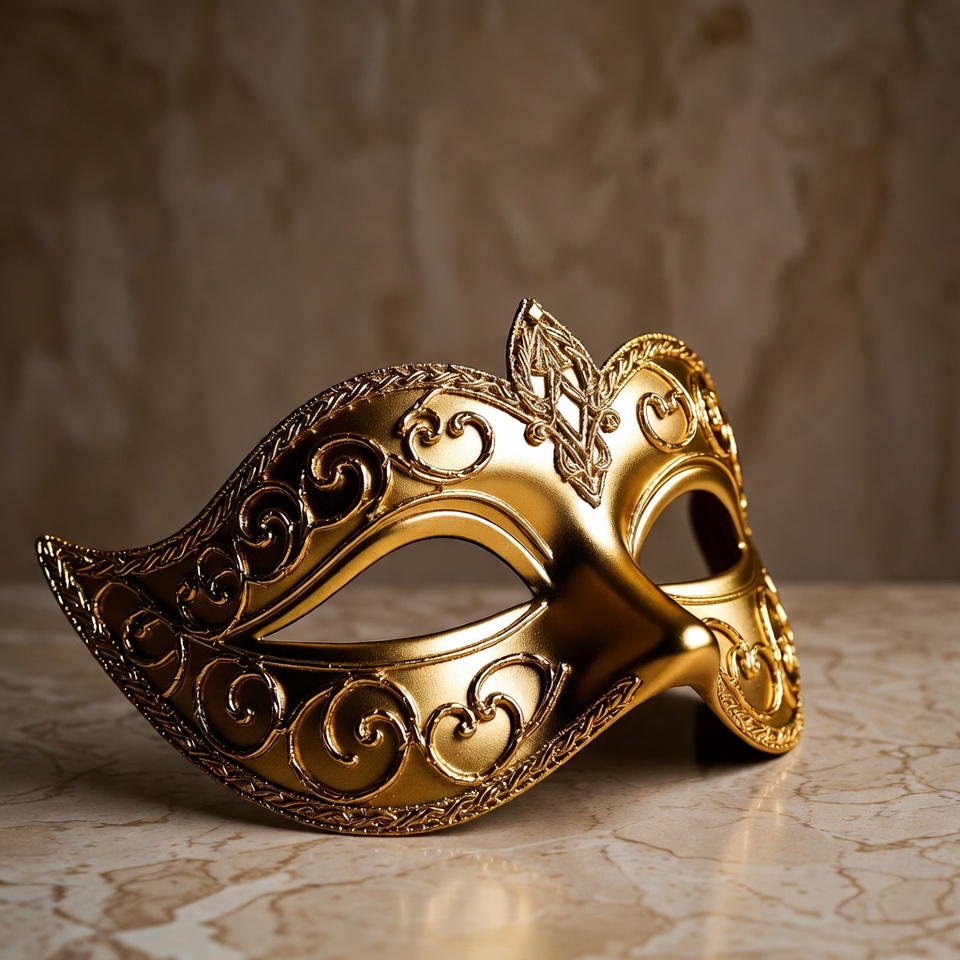 An ornate gold masquerade mask with intricate filigree designs rests on a marble surface. The mask features elaborate swirls, feathers, and eye openings typical of Venetian carnival style. It is set against a warm, blurred golden background.