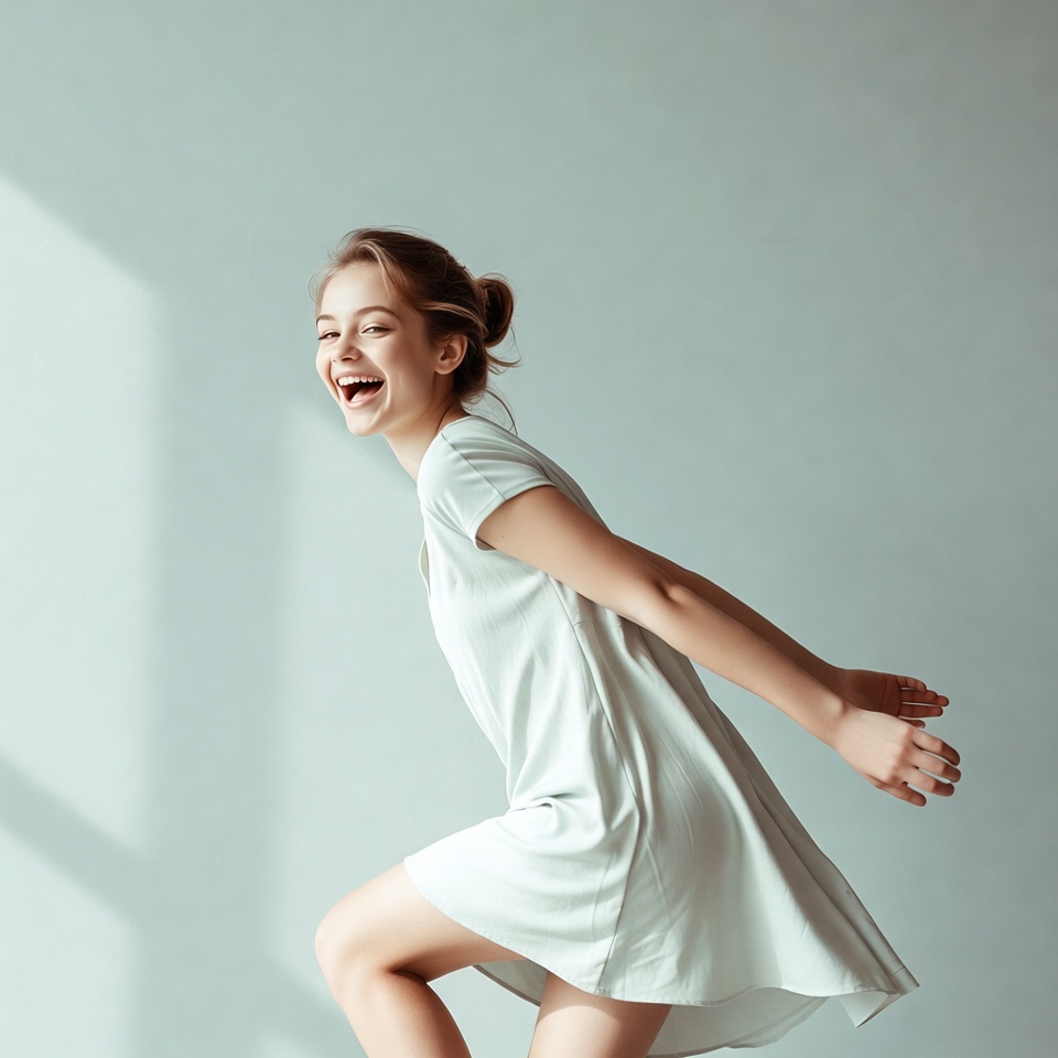 A young woman with light brown hair in a bun laughs with her mouth open and eyes squinted in joy. She wears a short white sleeveless dress and jumps dynamically with arms outstretched. She poses against a light blue background with soft window light.