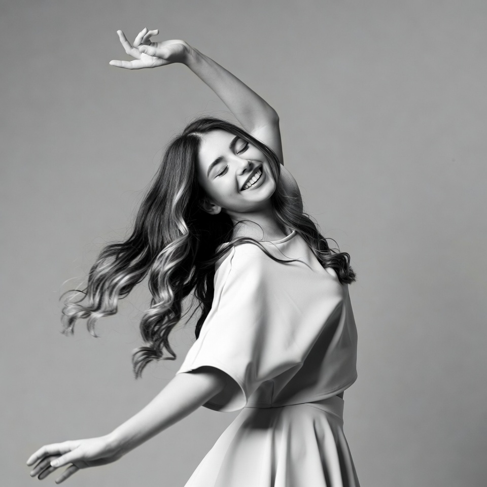 A young woman with long wavy hair dances joyfully in a black and white photo. She wears a loose off-shoulder top and flared skirt, with arms extended gracefully overhead and hair flowing dynamically. She smiles broadly while captured in dynamic motion against a plain background.