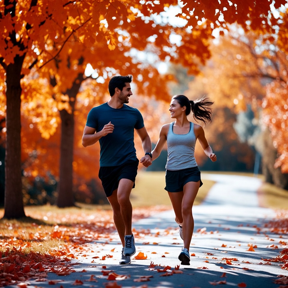 A smiling man and woman hold hands while jogging on a tree-lined path surrounded by vibrant orange and red autumn leaves. The man wears a blue t-shirt and black shorts, and the woman wears a gray tank top and shorts. They run energetically along the shaded trail with fallen leaves scattered on the ground.