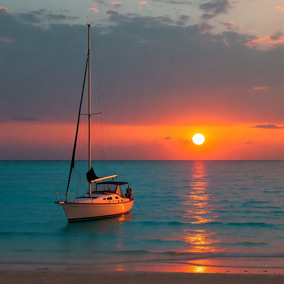 anchored boat, beach, boat, cabin, calm sea, evening, horizon, mast, ocean, orange sky, sails, sand, sea, shore, sun reflection, sunset, turquoise water, water, yacht, sailboat
