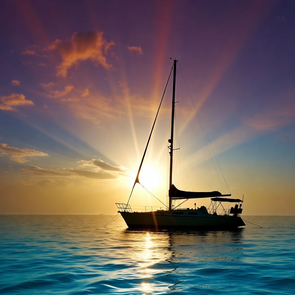 A sailboat with tall mast and sails is silhouetted against a vibrant purple and orange sunset over calm ocean waters. Sun rays beam through scattered clouds, reflecting golden light on the water. The boat floats gently with its hull partially submerged in the serene sea.