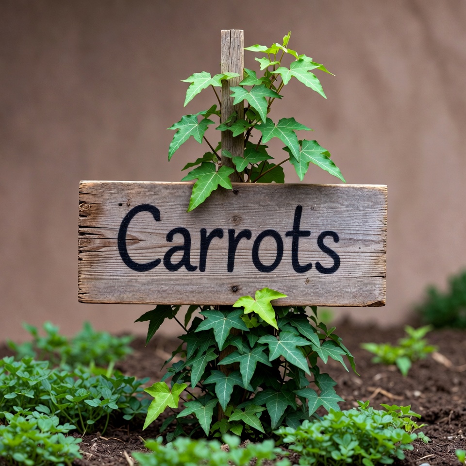 A wooden sign reading 'Carrots' stands on a stake surrounded by green ivy leaves. It is placed in a garden bed with soil and small green plants. The background is a neutral brown.