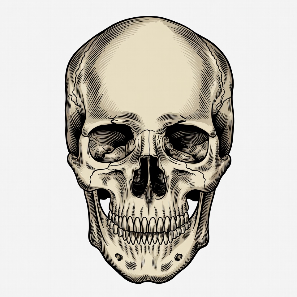 Halloween, anatomical, anatomy, bones, death, detailed, front view, grinning skull, human skull, illustration, isolated background, line art, realistic, skeleton, white background, skull