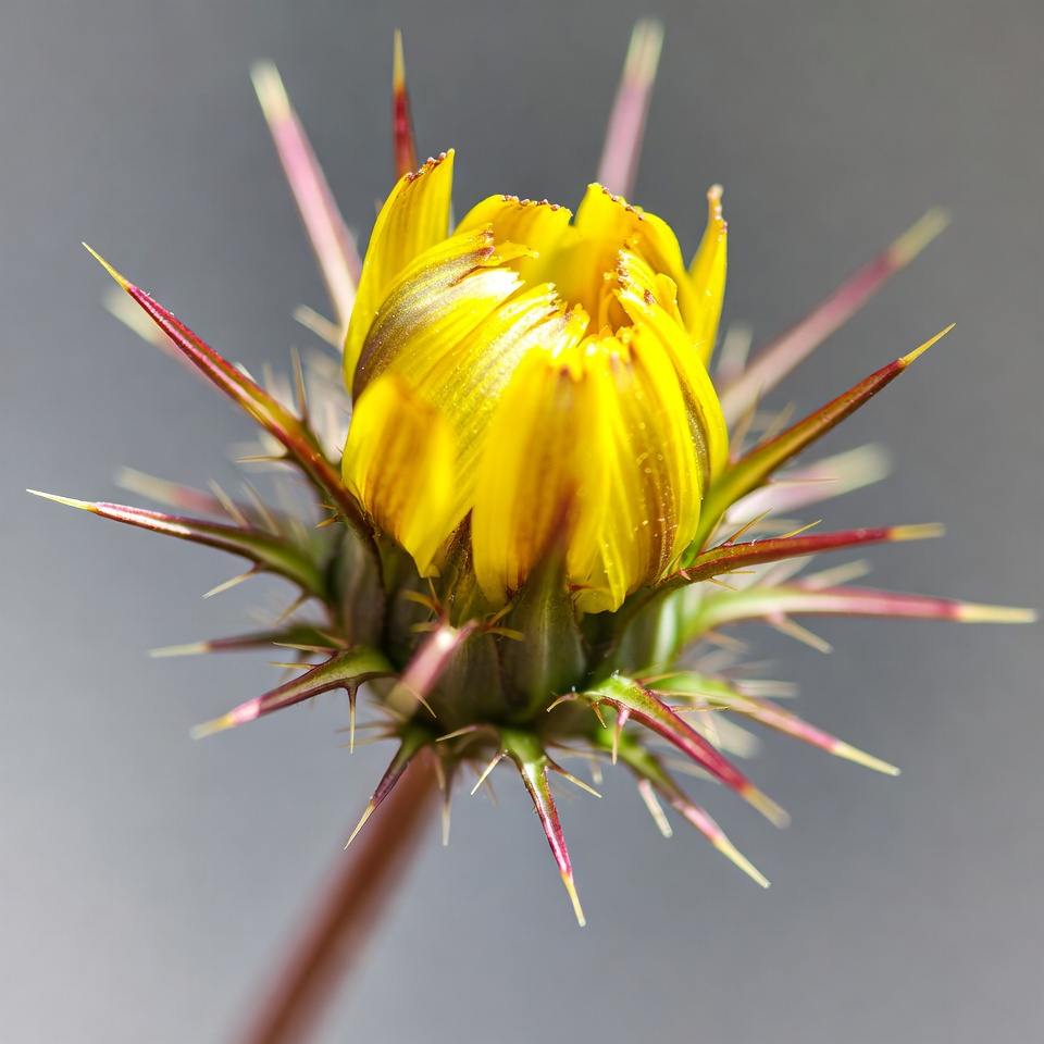 bloom, flower closeup, green stem, isolated background, macro photography, nature, plant, red bracts, sharp spines, spiny flower, wildflower, yellow flower, thistle flower