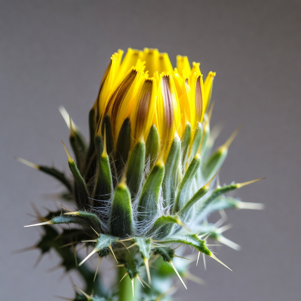 bloom, botany, closeup, flower head, green stem, isolated background, macro photography, nature, petals, plant, prickly, spiky plant, thorny bracts, wildflower, yellow flower, thistle flower