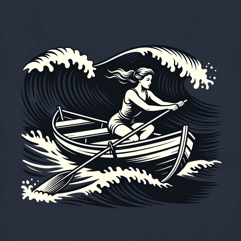 A black and white illustration depicts a woman with flowing hair rowing a wooden rowboat amidst turbulent ocean waves. She wears a tank top and shorts, gripping the oars firmly while seated in the small boat. Dynamic waves crash around the boat in a dramatic nautical scene.