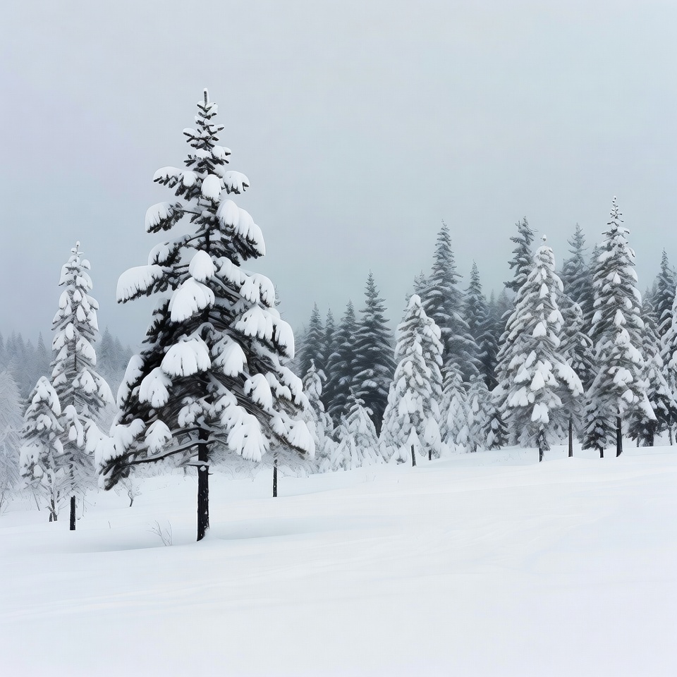Tall pine trees covered in heavy snow stand in a vast snowy field under a foggy gray sky. The foreground features a prominent fir tree with snow-laden branches, surrounded by a dense forest of similar snow-dusted evergreens. The scene captures a serene winter landscape with fresh powder blanketing the ground.