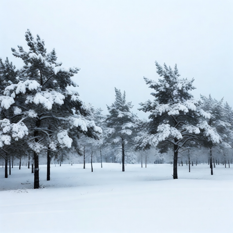 Several pine trees covered in heavy snow stand in a vast snowy field under a pale gray sky. The trees have dense branches laden with fresh snow, creating a serene winter landscape. The ground is blanketed in deep white snow with no other elements visible.